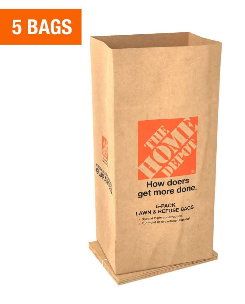 The Home Depot 30 Gal. Paper Lawn and Refuse Bags (5-Pack) feature 2-ply wet-strength paper construction for durability and tear resistance. The bags are suitable for moist or dry refuse disposal. Suitable for use in composting in your garden. Packaging: Reusable