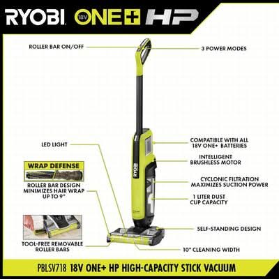 The RYOBI 18V ONE+ HP High-Capacity Stick Vacuum Kit is designed for your convenience and maneuverability, weighing only 3 lbs. when in use, making it RYOBI’s lightest weight in hand stick vacuum. This vacuum is Pet Rated, equipped with a Wrap Defense roller bar design that minimizes hair wrap up to 9 in. long. ONE+ HP Technology delivers more power, runtime, durability and speed utilizing intelligent brushless motors, advanced electronics and HIGH Cancer and Reproductive Harm - www.p65warnings.ca.gov