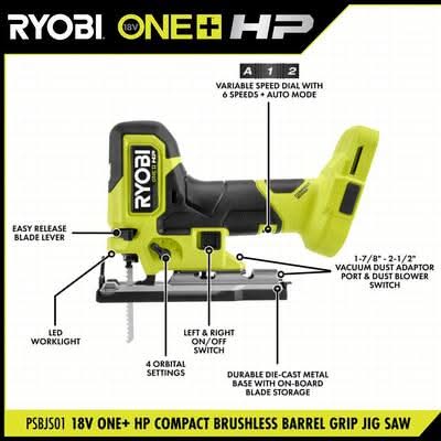 The RYOBI 18V ONE+ HP Compact Brushless Barrel Grip Jig Saw features ONE+ HP Technology, delivering more power, runtime, durability and speed utilizing brushless motors, advanced electronics and HIGH PERFORMANCE lithium technology. RYOBI 18V ONE+ HP Compact Series tools are the lightest and most compact tools RYOBI offers, while still delivering the power to get the job done. Experience fast cutting through hard material with speeds up to 3,200 SPM, 1" Cancer and Reproductive Harm - www.p65warnings.ca.gov