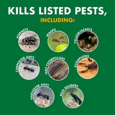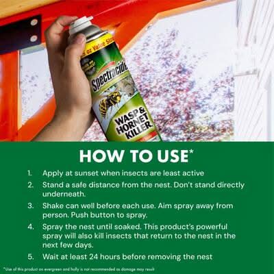 The power is in your hands to keep your landscape in line - unleash it with Spectracide lawn and garden products. Our easy-to-use insect, lawn disease and weed control solutions help you tame lawn and landscape invaders with incredible pest-punishing power. Take command with Spectracide brand. You hold the power. Spectracide Wasp and Hornet Killer3 aerosol eliminates wasp and hornet nests with a jet spray that reaches up to 27 feet. This twin pack contains 2-20 ounce cans. Use this product outdoors where insects live and breed. This product's powerful spray will also kill insects that return to the nest over the next few days. The non-staining formula can be used around most home siding depending on age and cleanliness (see product label for details). Also controls tent caterpillars, scorpions and ants. To control wasps, hornets and yellowjackets, spray at sunset when these insects are least active. Stand a safe distance from the nest - don't stand directly underneath. If it's windy, stand with the wind at your back to avoid spray drift. Spray the nest until soaked. Wait at least 24 hours before removing the nest. Do not use this product in or on electrical equipment due to the possibility of shock hazard.