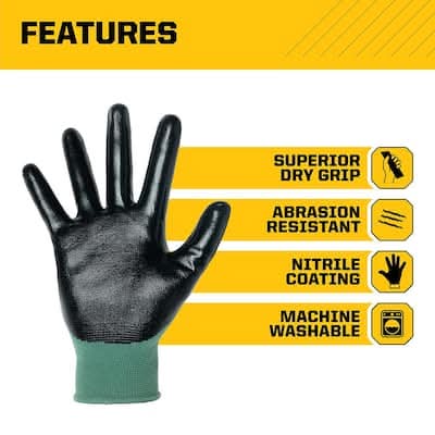 Nitrile coated gloves offer superior performance in a variety of applications and across a broad range of industries. They are lightweight, offer great dexterity and fit snug like a second skin. The nitrile coating on the palms and fingers delivers enhanced dry gripping power and control while creating a barrier of protection against liquids, epoxies, adhesives, greases and oils. The back-of-hand knit construction is designed to be breathable f WARNING: Cancer and Reproductive Harm - www.P65Warnings.ca.gov • Color: Green • Size: Large • male