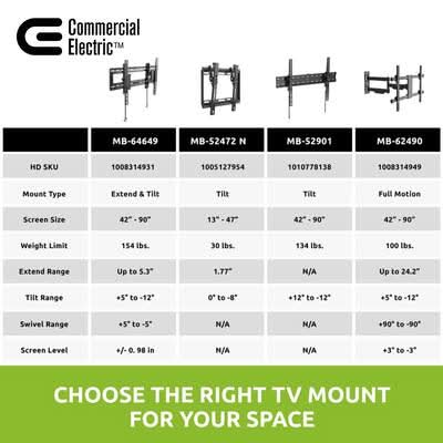 Upgrade your viewing experience with the Tilt TV Wall Mount from Commercial Electric. Designed to accommodate large flat-screen TVs from 42 to 90 in. and weighing up to 134 lbs. This heavy-duty mount offers exceptional stability and versatility. Enjoy optimal viewing angles with the adjustable tilt feature, ranging from +12 ° to -12 °, to eliminate glare and reduce eye strain. Our full motion mount ensures perfect screen positioning, allowing you to customize your viewing experience. Installation is a breeze with included hardware and a built-in level. The auto-lock mechanism provides quick and secure mounting, while the easy release feature allows for convenient TV adjustments. Compatible with VESA mounting standards from 200 x 200 mm to 600 x 400 mm, this mount fits a wide range of TV models. Experience the ultimate in TV mounting solutions.