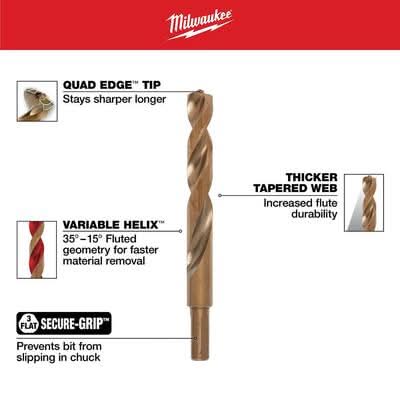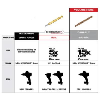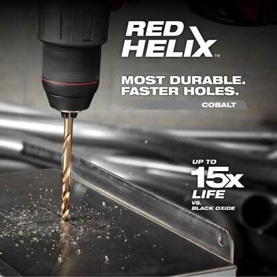 The MILWAUKEE RED HELIX 15PC Cobalt Drill Bit Set is engineered for extreme durability and long life in hard metal applications. The QUAD EDGE tip delivers a precision start and features four cutting edges to create smaller chips for faster material removal and less heat leading to improved performance. Designed with a VARIABLE HELIX flute that begins with an aggressive 35° helical angle and ends at 15° for rapid chip removal. The bit also features an internal thicker tapered web that greatly increases strength, reducing premature breakage. Ideal for various tough metal applications including but not limited to Stainless Steel, Cast Iron, and Thick Metal. MILWAUKEE RED HELIX Cobalt Drill Bits provide up to 15X life vs. black oxide drill bits. Set is organized in a customizable accessory case designed for use in PACKOUT.