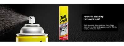 For fabric and carpets, test first on a hidden area to ensure colorfastness and resistance to staining or spotting. 1. shake well. 2. hold can upright and spray liberally on surface to be cleaned. 3. let tuff stuff foam work for 30 to 40 seconds. 4. scrub with damp cloth, sponge or brush if required. 5. wipe clean with dry cloth. 6. to avoid spotting, wipe overspray from glass or car finish before it dries. if it should dry, use powdered cleanser to remove from glass, and car polish to remove from finish.