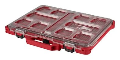 The PACKOUT modular storage system is the industry's most durable and versatile storage system. The PACKOUT low-profile organizer is constructed with impact resistant materials so it can withstand harsh jobsite environments. An IP65 rated weather seal protects your tools, accessories and small parts from rain and other jobsite debris. The shallow organizer's interior features 10 removable storage bins that are easily mountable on the jobsite for quick access. The transparent lid of the organizer seals the bins to prevent contents from migrating and shifting during transport. Heavy-duty latches and reinforced hinges ensure that the slim organizer keeps the contents contained and protected. The PACKOUT modular storage allows users to customize and build their own storage system to easily transport and organize tools and accessories.