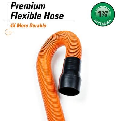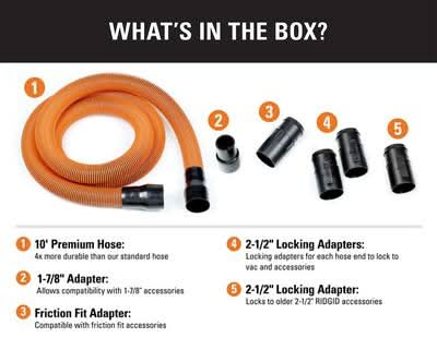 RIDGID's 1-7/8 in. Pro-Grade Locking Vacuum Hose Kit extends up to 10 ft. for extra reach and is 4X more durable than standard RIDGID hoses. This RIDGID Pro-Grade hose is highly flexible while resisting collapsing. It fits all RIDGID 2-1/2 in. inlet configurations and includes 5 adapters for compatibility. With the new locking design, your hose locks onto both your shop vac and your wand or accessory, so nothing falls during use. Easily detach by releasing the locking tab or twisting off. The 2-1/2 in. diameter opening is the optimal size for tackling large messes with a RIDGID wet dry vac. Maximize your RIDGID shop vac and get the most out of your cleaning tools with RIDGID's 2-1/2 in. locking accessories. Size: 10'