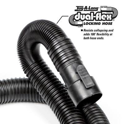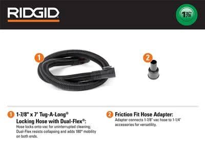 This RIDGID Tug-A-Long Replacement Wet Dry Vac Hose features a 1-7/8 in. opening and is 7 feet long. This kit includes an adapter that pairs 1-7/8 in. hoses to 1-1/4 in. shop vac accessories. Another convenient feature is the locking tab on the hose cuff, which provides a secure connection to the vac, so it won't pull loose during use. This RIDGID wet dry vacuum hose is originally included with most RIDGID 4 gal., 6 gal. and 9 gal. vacuums and includes the necessary cuff to fit most RIDGID vacs. • Color: Black • Size: 1-7/8 in x 7 ft