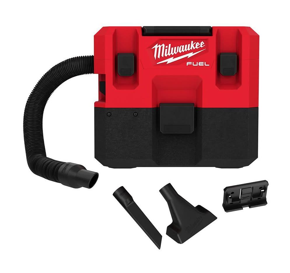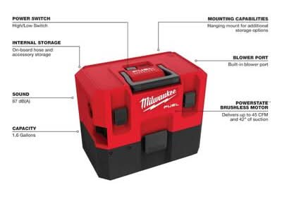 The Milwaukee M12 FUEL 1.6 Gal. Wet/Dry Vacuum is the first cordless 12-Volt wet/dry vacuum of its kind. It delivers up to 40% more suction than 18-Volt competitors, is the most compact, and is up to 2X quieter compared to other common wet/dry vacuums. The POWERSTATE brushless motor delivers up to 45 CFM and 42 in. of suction. It's compact footprint stores neatly in a van or cart with a stackable design and organized on-board storage conveniently keeps the attachments inside of the unit. It also comes with a wall mount hanging plate for increased storage options. With 14-minutes of runtime on high and 26-minutes on the low setting, this compact vacuum cleaner is ideal for spot and service focused wet/dry quick clean up needs. The cordless wet/dry vac (0960-20) comes with a flexible hose, crevice tool, utility nozzle, wall mount, and a certified HEPA filter.