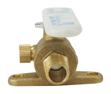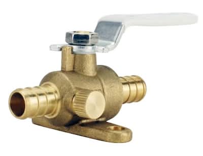 The ApolloPEX 1/2 in. Brass PEX Barb Ball Valve with drain and mounting pad is simple to install and provides flow control through an anti-stick and smooth operating quarter turn lever handle. The quarter turn, single lever control allows for simple control of water flow in hydronic and potable water systems and the side vent This product contains chemicals known to the state of California to cause cancer and birth defects or other reproductive harm. Further information available at www.p65warnings.ca.gov.