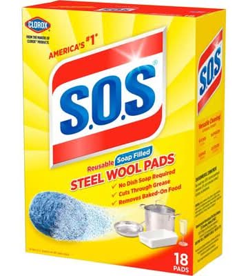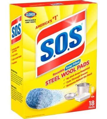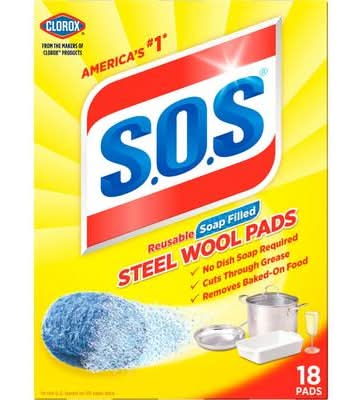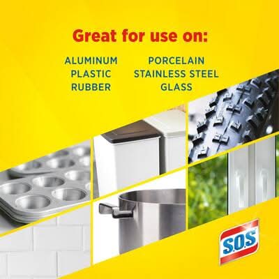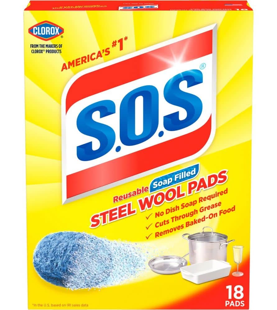 S.O.S Steel Wool Soap Pads are tough so you don't have to be. Made with durable steel wool and saturated with long-lasting soap, these pads cut through even the toughest baked-on, greasy, grimy messes. They are perfect for cleaning ovens, broilers, cookie sheets and pots and pans. These reusable steel wool soap pads are great outside the kitchen, too. From scrubbing stoves and shower doors to cleaning grills and golf clubs, S.O.S Steel Wool Soap Pads quickly removes stubborn grease, rust and stains inside and outside your home. The soap contains rust inhibitors, preservatives, soaps and detergents, a pH buffer, fragrance and color. Cleaning is quick and easy with S.O.S. • The Clorox Company, Oakland, CA, 94612 • Packaging: Reusable