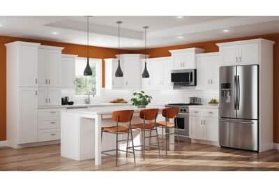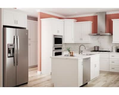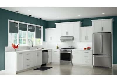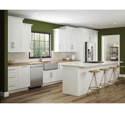 The Contractor Express Arlington Vesper White shaker cabinets and accessories feature a durable thermo-foil finish, which will create a bright finish in any kitchen. MDF doors and drawer fronts feature a detailed recessed center panel and are wrapped with a durable thermo-foil finish. Cabinets feature CARB compliant plywood construction with full-depth 3/4 in. thick adjustable shelves for added storage.