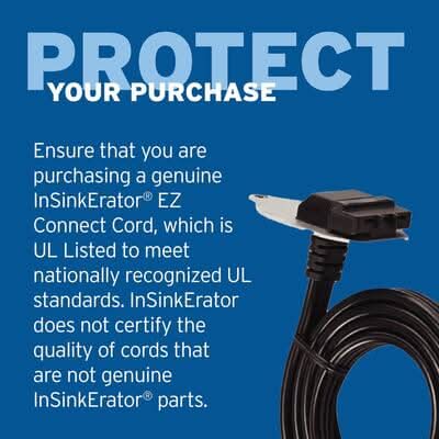 The INSINKERATOR EZ Connect Cord offers a fast, easy, and convenient way to connect a power cord to EZ Connect INSINKERATOR garbage disposals so they quickly can be plugged into wall outlets under the kitchen sink. Compatible with INSINKERATOR EZ Connect Power and Advanced Series continuous feed garbage disposer models, the UL-Listed EZ Connect Cord inserts directly into the bottom of the sink disposal in a few simple steps, eliminating the need to connect wires when attaching the power cord to the disposer. Once installed, the sink garbage disposal power cord plugs into a standard wall outlet. The EZ Connect Cord is one of the many ways that INSINKERATOR helps to make installing your garbage disposal easy. Your kitchen is the heart of your home, where you gather with family and other loved ones. The perfect complement to every kitchen since 1938, INSINKERATOR has been making products that aren't just better for your family, they're better for your world. Simple solutions from INSINKERATOR. KITCHEN BETTER. • Color: Black • Size: 3 Ft.
