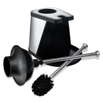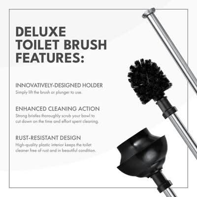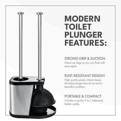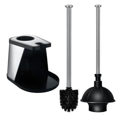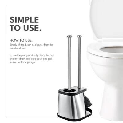Tackle toilet troubles and keep your bathroom spotless with the ToiletTree Heavy Duty Toilet Brush and Plunger Combo Set. Designed for efficiency, hygiene, and modern style, this set includes a powerful bathroom plunger and a hygienic toilet bowl brush, both with collapsible stainless steel handles that screw together for space-saving storage. The compact duo canister base features a non-slip design and catches excess water to keep your floors dry and clean.Say goodbye to stubborn clogs with our heavy-duty toilet plunger, designed with a high-suction rubber cup and ergonomic handle for maximum force with minimal effort. Pair it with our durable toilet brush, built with a replaceable head for long-term use and easy scrubbing. Hidden neatly in the sleek hideaway canister, your bathroom essentials stay discreet and organized. The stylish stainless steel finish adds a modern touch to any bathroom while keeping hygiene a top priority.