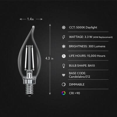 Upgrade your lighting to Feit Electric's elegant Exposed White Filament Flame BA10 LED Bulbs for a fresh take on decorative bulbs. These first-of-their-kind white filament bulbs take a traditional flame tip bulb encased in clear glass and add lower-profile white filaments. Unlike yellow filaments, these blend into your current decor, for a timeless look that complements any room. It's 5000K Daylight glow perfectly sets a cool, invigorating atmosphere ideal for spaces that need a bright light source without the worry of a harsh glare. Use these bulbs in any fixture with a Candelabra E12 base socket such as chandeliers, wall sconces, coach lanterns, and more. CFC40950CAWFILHDRP/3 bulbs emit 300 lumens of light while using just 3.3-watts, up to 91.8% less energy than standard 40-watt incandescent bulbs. A 90 plus CRI infuses vibrance into your space, bringing out truer colors and more natural skin tones. Get up to 15,000 hours of life with an estimated energy cost of only $0.40 per year. Create a stylish feel that instantly enhances any home or commercial space.