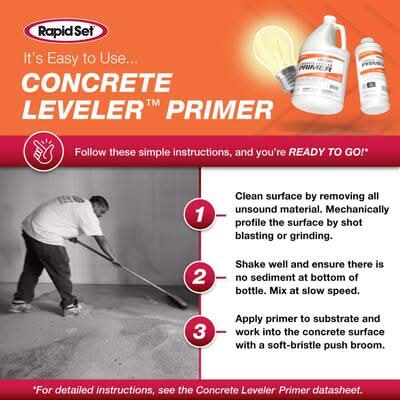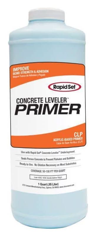 Rapid Set Concrete Leveler Primer (CLP) improves the adhesion of Concrete Leveler to properly prepared concrete. CLP also seals porous concrete surfaces to prevent pinholes and bubbles from forming in the finished surface. One quart covers about 50 sq. ft. to 100 sq. ft. Cancer and Reproductive Harm - www.P65Warnings.ca.gov