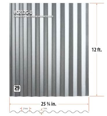 Gibraltar's galvanized steel corrugated panels are trusted by professionals and homeowners for a variety of applications. This durable and lightweight panel is ideal for roofing and siding, but also has many other uses including: privacy fencing, back splashes, ceilings, wainscoting and craft projects. The distinctive galvanized finish will stand up to all kinds of weather and can be painted or aged for a variety of interesting visual effects. Corrugate Cancer and Reproductive Harm - www.P65Warnings.ca.gov Size: 12 ft