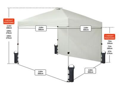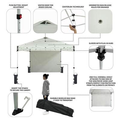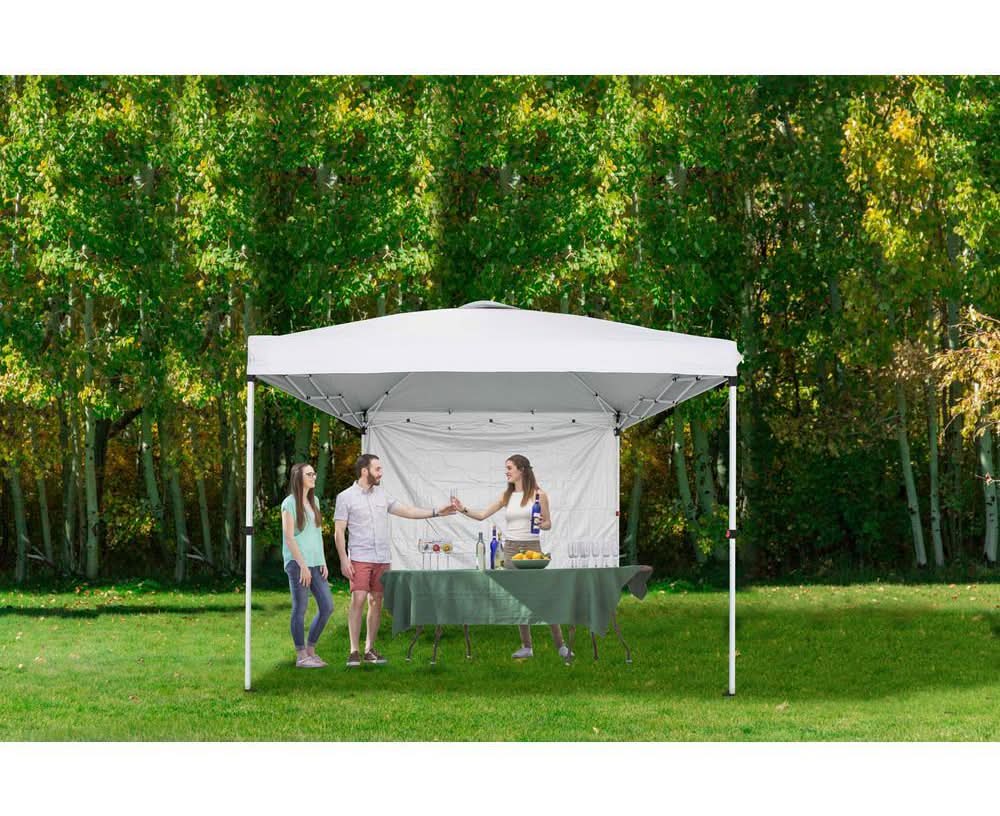The Everbilt Commercial 10 ft. x 10 ft. Instant Canopy-Pop Up Tent is perfect for any promotional event, fair, farmers market, craft show or outdoor, backyard, tailgate, athletic, camping and recreational activities. This instant canopy is easy to operate with a central hub for easy 1 hand open and close operation. The commercial design provides great shade, sun-protection to block UV rays and incorporates a side wall for versatility for up to 12 people to enjoy at any event or activity. Designed with a 1-piece powder-coated steel frame with push button legs for easy height adjustment. The Everbilt 10 ft. x 10 ft. Commercial Instant Canopy is easy to set up, take down, store and transport anywhere with the durable wheeled bag included. • Color: White • Size: 10x10 ft