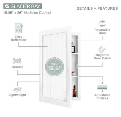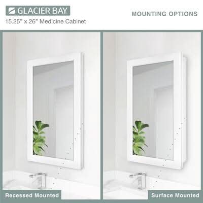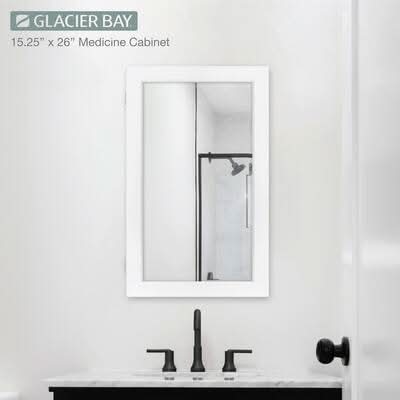 The Glacier Bay 15.25 in. W x 26 in. H x 4.54 in. D white shaker framed recessed or surface-mount bathroom medicine cabinet is a great addition to your bathroom or powder room. Includes 2-adjustable interior shelves to give you flexible storage space. Double shelf Drilling, sawing, sanding or machining wood products can expose you to wood dust, a substance known to the state of California to cause cancer. Avoid wood dust or use a dust mask or other safeguards for personal protection. www.p65warnings.ca.gov • Color: White • Size: 15.25" x 26"