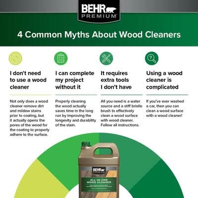 Behr Premium All-In-One Wood Cleaner helps transform old, dirty, mildew stained wood surfaces into clean wood that is then ready to stain or finish. Ideal for decks, fences and siding. Removes exterior stains caused by mold, mildew, algae and fungus. Cancer and Reproductive Harm - https://www.p65warnings.ca.gov/