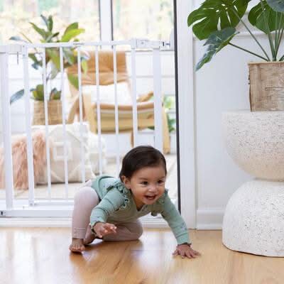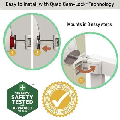 The Doorway 37 in. S Series Quad Cam Lock Gate in White features a durable steel design and is super easy to install and to know you did it correctly. It can be no-drill mounted for use in doorways and between rooms, or hardware mounted at the top of stairs with the included hardware kit. • Color: White • Size: 37 In