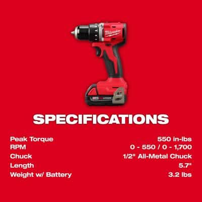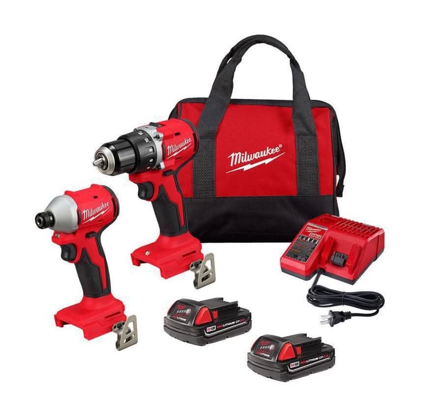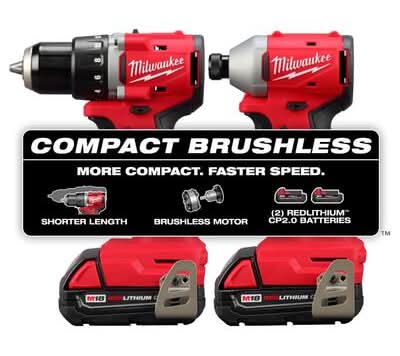The MILWAUKEE M18 Compact Brushless 2-Tool Combo Kit is more compact with faster speeds in the application. Includes the M18 Compact Brushless ½" Drill Driver, M18 Compact Brushless ¼" Hex Impact Driver, (2) M18 REDLITHIUM CP2.0 Battery Packs, M18/M12 Multi-volt Charger and Contractor Bag. The compact drill is 5.7" in length and lightweight at 2.3 lbs without a battery allowing for excellent control, especially while working in overhead or tight spaces. The brushless motor was built to ensure optimal tool performance delivering 550 in-lbs of torque and 0-1,700 RPM, able to tackle a wide range of drilling and fastening applications. The impact driver measures only 4.4" in length and 2.1" in width, allowing for better access in tight spaces while being lightweight and portable. The brushless motor technology provides 1,700 in-lbs of torque and 3600 RPMs for faster speed and increased productivity. MILWAUKEE REDLINK Intelligence optimizes the way the M18 REDLITHIUM batteries work with the tools for best-in-class performance. These cordless tools have premium components, including an all-metal gear case and ½" metal chuck providing the durability that professionals require. The M18 Compact Brushless 2-Tool Combo Kit is part of the M18 system, fully compatible with over 250+ solutions.