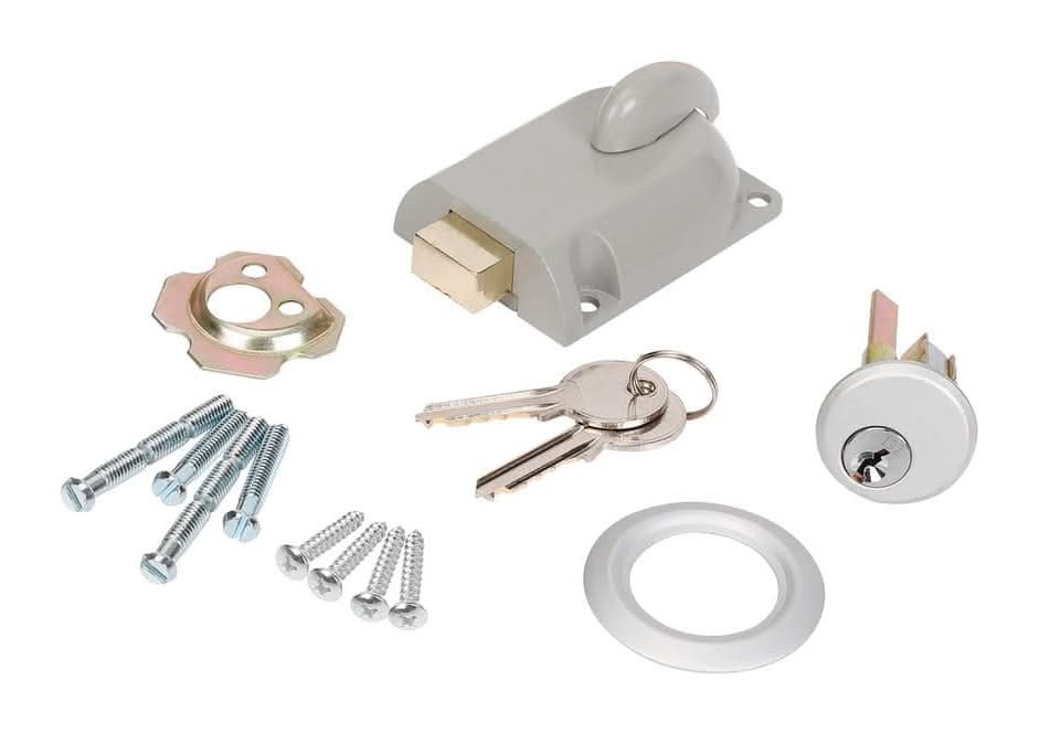 The Everbilt Garage Door Dead-Bolt Lock with Cylinder Consists of a dead bolt mechanism, key cylinder assembly, 2-keys and mounting hardware. The key can be removed in the locked- as well as the unlocked position. The lock has pre-drilled holes for installation. This product contains chemicals known to the State of California to cause cancer and birth defects or other reproductive harm. For more infomation go to www.P65Warnings.ca.gov