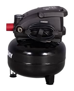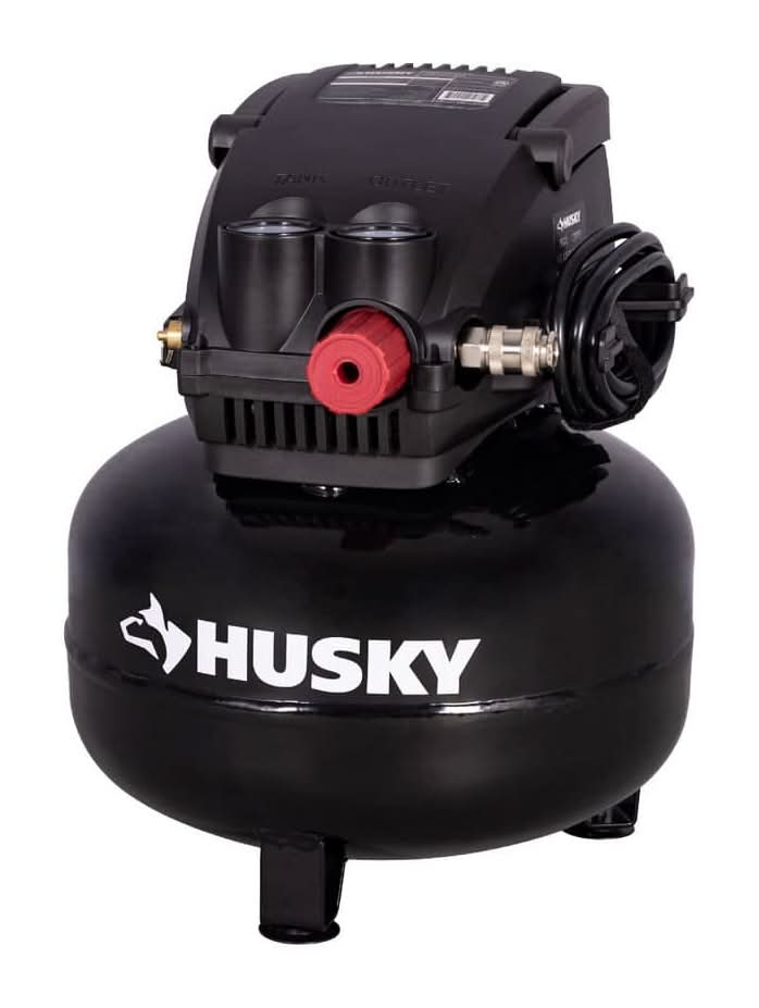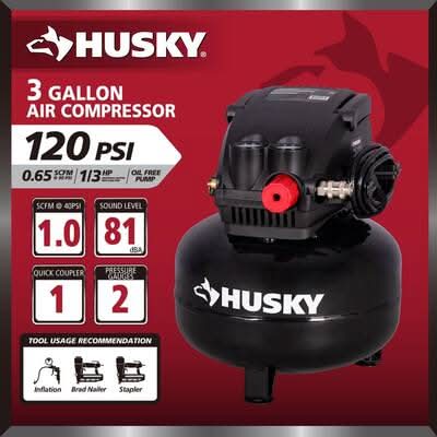 The Husky 3 Gal. 120 PSI Portable Electric Oil-Free Light Duty Pancake Air Compressor with Fold Down Handle and 1-Quick Coupler offers a dependable solution for inflation needs. Fast Inflation highlights its ability to quickly inflate tires, sports balls, and air mattresses, powered by a 1/3 HP mot This product can expose you to chemicals including lead, which is known to the State of California to cause cancer and birth defects or other reproductive harm. For more information go to www.P65Warnings.ca.gov. Size: 3 Gal