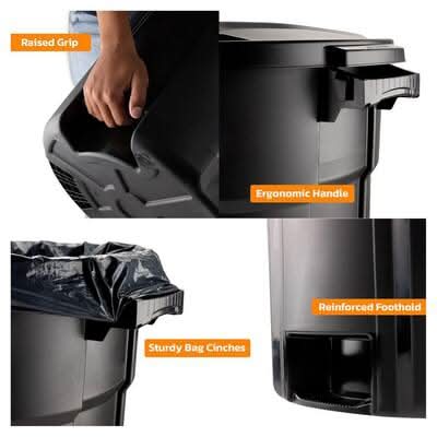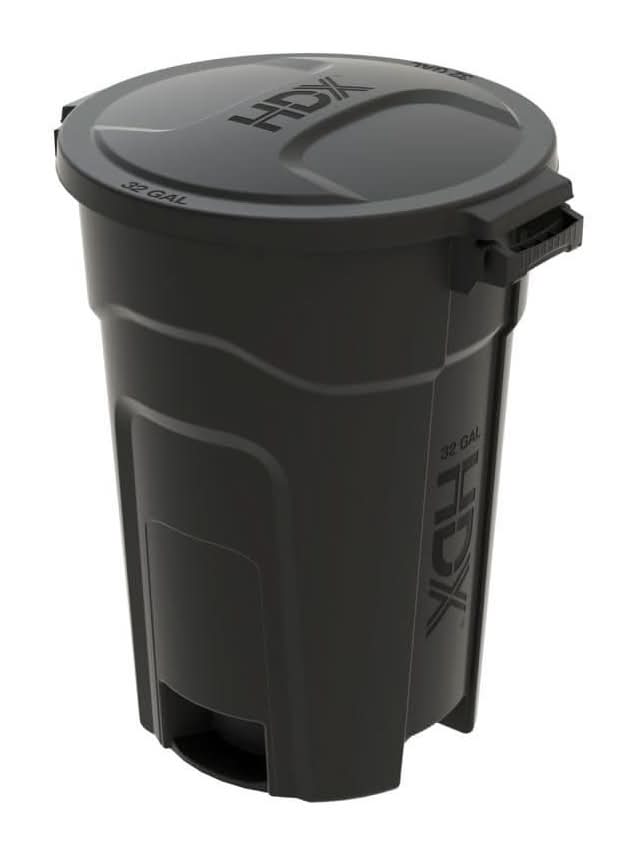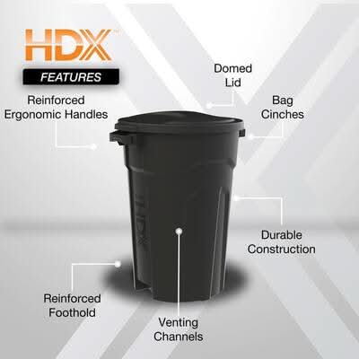 The HDX 32 Gal. trash can is engineered for durable residential efficiency. With its reinforced foothold and innovative venting channels, removing liners has never been easier. This trash can also features a raised lower grip area and an ergonomic handle with convenient bag cinches, making trash disposal a breeze. The domed lid ensures water runoff, while the cans' ability to nest together maximizes storage efficiency. Emblazoned with bold HDX branding and high-polished feature callouts, including the gallon size, it combines functionality with style. Crafted from a high-quality proprietary resin material that boasts UV resistance, it's built to withstand extreme conditions without fading, cracking or crushing. The rounded handles, reinforced for extra durability, facilitate easy lifting and moving, even under heavy loads. The reinforced base is specifically designed to endure being dragged over rough surfaces, significantly extending the can's lifespan and overall durability. Additionally, contoured base handles and a rim enhanced with an integrated rib structure offer improved grip and ergonomics, reducing strain and boosting efficiency during emptying. This trash can doesn't just hold waste; HDX is committed to quality and designed to make trash management as convenient and reliable as possible. Color: Black