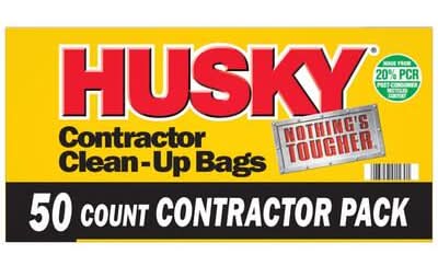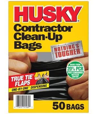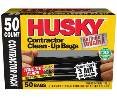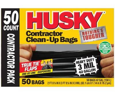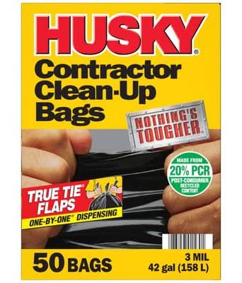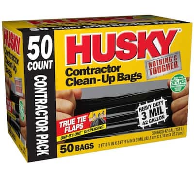The Husky 42 Gal. Clean-up Bags (50-count) are ideal for all your tough clean-up jobs. Featuring a tear and puncture-resistant design, it includes true tie flaps and 1-by-1 dispensing for an easy use. Manufactured in a 3 mil thickness, this heavy-duty bag is strong enough for contractor, commercial or home use. Made with 20% post-consumer recycled content. Color: Black