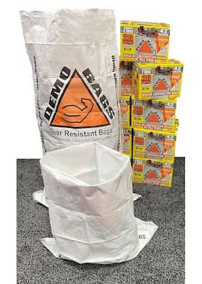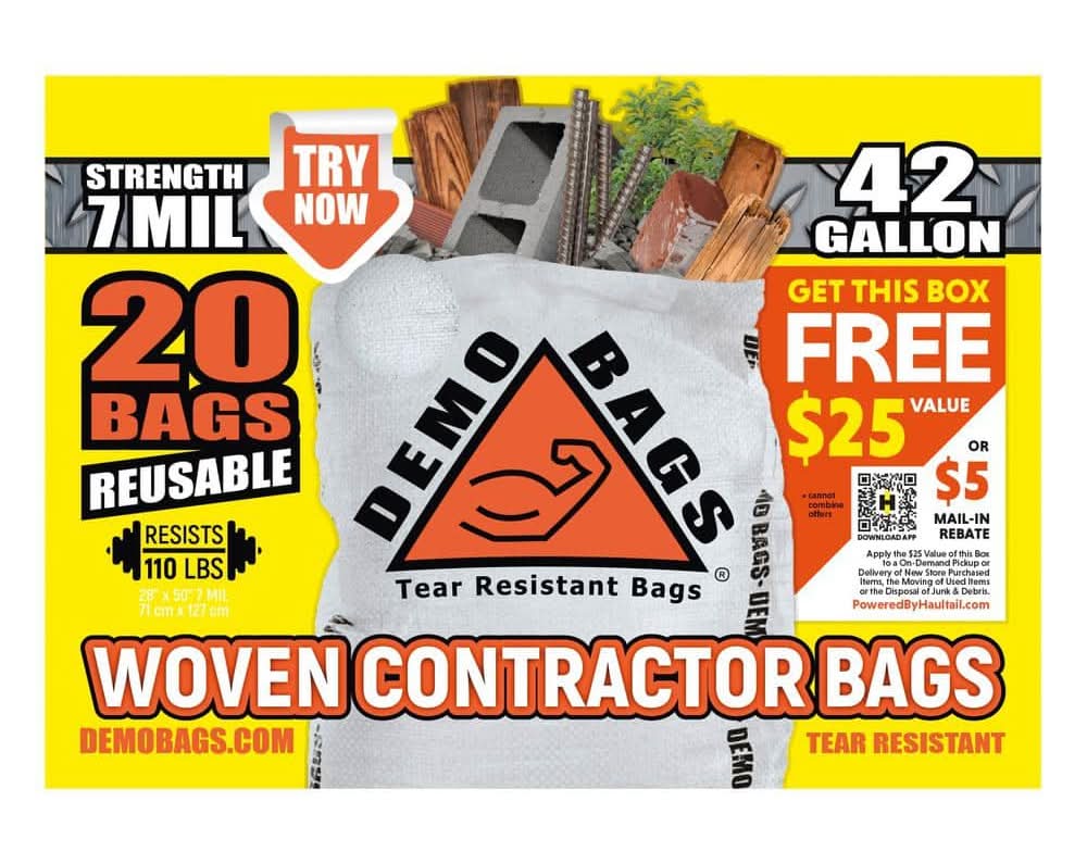 The Demobags 42-Gallon Contractor Trash Bags were designed to handle all of your construction debris, from nail-embedded wood to cement chunks and plaster dust. They're coated to keep fine dust in and moisture out. Made of polypropylene, each bag can handle up to 110 lbs. of building waste and rubble. Packaging: Reusable