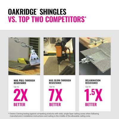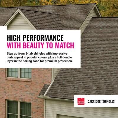 Oakridge laminated shingles have a warm, inviting look in popular colors for a step up from traditional 3-tab shingles. Oakridge shingles are designed to provide long-lasting performance and striking beauty. In addition to a wide range of inviting, popular colors, they also offer the following features and benefits.