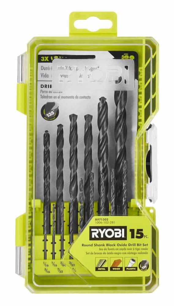 RYOBI introduces the 15-Piece Round Shank Black Oxide Drill Bit Set. This assortment of drilling bits are perfect for materials including wood, metal, and plastic surfaces. The bits are constructed out of high speed steel with a black oxide finish to offer superior durability and 3X longer life. Another feature of these bits is the 135 degree split point to drill on contact and prevent your bit from walking. The clear case cover provides visibility for Cancer and Reproductive Harm - www.p65warnings.ca.gov Color: Black