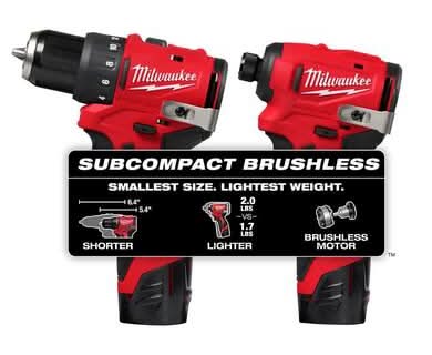 The MILWAUKEE M12 Subcompact Brushless 2-Tool Combo Kit features the most compact and lightest weight drill and impact driver, providing ultimate access into tight spaces. This kit includes the M12 Subcompact Brushless 3/8" Drill/Driver, M12 Subcompact Brushless ¼" Hex Impact Driver, (2) M12 REDLITHIUM CP2.0 Battery Packs, M12 Charger and Contractor Bag. The compact drill is only 5.4" in length and under 2 pounds with battery, allowing for minimal fatigue and excellent control, especially while working overhead or in tight spaces. The brushless motor delivers optimal tool performance at 350 in-lbs. of torque and up to 1,550 RPM, able to tackle a wide range of drilling and fastening applications. The drill features premium components, including a 3/8" metal chuck providing best-in-class durability. The impact driver measures only 4.3" in length and 2.0" in width, allowing for best access in tight spaces and weighing only 1.7 pounds with battery. The brushless motor technology provides faster driving speeds with 1,100 in-lbs. of torque and up to 3,000 RPM to increase productivity. An internal metal gearcase delivers robust strength and durability. MILWAUKEE REDLINK Intelligence communicates with the M12 REDLITHIUM batteries to deliver optimal performance for the tools. The M12 Subcompact Brushless 2-Tool Combo Kit is part of the M12 system, fully compatible with over 150+ solutions.