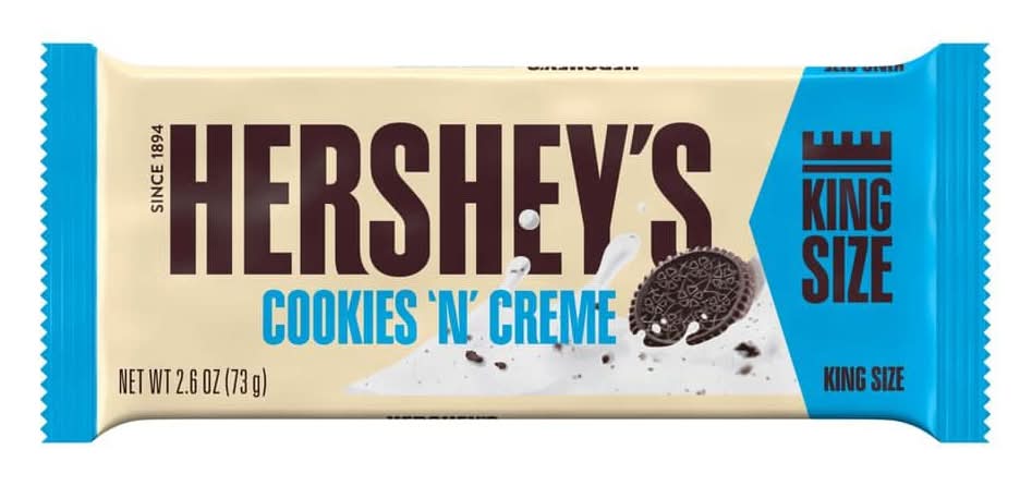 The only thing bigger than HERSHEY'S Cookies n Creme Bars will be the smiles on the faces of your family, friends and co-workers when you share this King Size bar with them. This bar is a unique twist on a classic with cookies in every bite. Prefect treat for yourself or friend anytime of day. • Flavor: Cookies 'n' creme • Size: King Size • Number of servings: 3 • The Hershey Company, Hershey, PA, 17033-0815