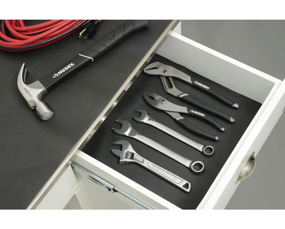 The Husky 18 in. W x 48 in. D Garage Grip Premium Shelf Liner features a black color that looks great in garages, workshops, tool sheds and more. The unique premium grip surface protects while staying in place and prevents most items from slipping. Extra thick which provides added cushioning and makes it great for heavy duty jobs, tool boxes, garage use or as added protection for horizontal surfaces. Designed to protect tool drawers and shelves against damage and can accommodate a variety of different shelf sizes well.