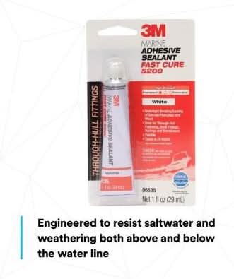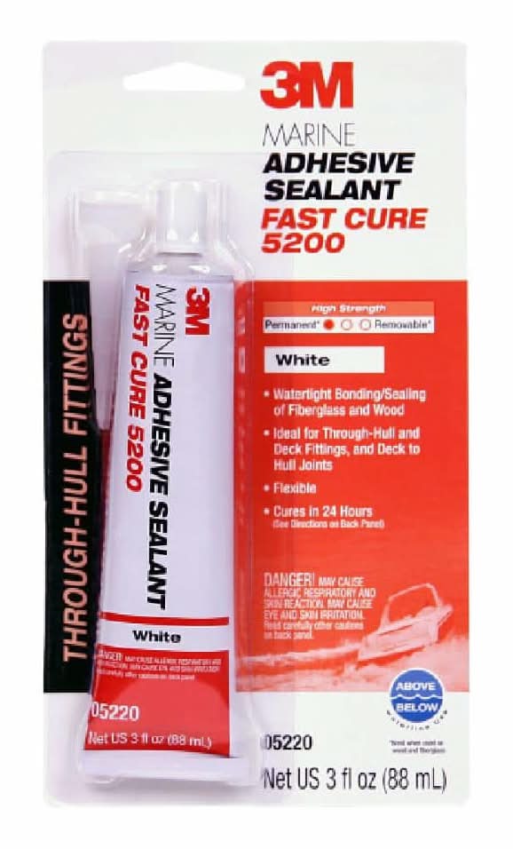 3M Marine Adhesive Sealant 5200 Fast Cure White is a fast drying, one-part polyurethane that chemically reacts with moisture to deliver strong, flexible bonds. It has excellent adhesion to wood, gel coat and fiberglass. It forms a watertight, weather-resistant seal on joints and boat hardware. In addition, its flexibility allows for dissipation of stress caused by shock, vibration, swelling or shrinking.
