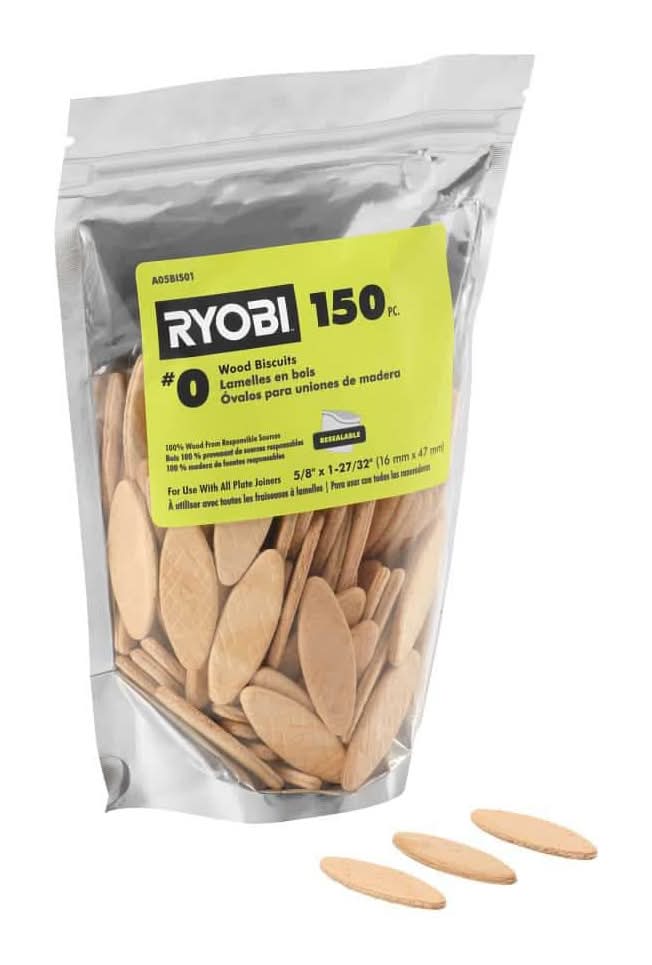 Complement your plate joiner with the RYOBI 150 PC. #0 Wood Biscuits. Perfect for reinforcing wood joints, the RYOBI #0 Wood Biscuits are compatible with all standard plate joiners, offering solid fit and strength. The wood biscuits swell when making contact with water-based glues, reinforcing the wood joints. These wood biscuits come in a resealable bag for convenient storage and transportation. Finally, all the wood biscuits are made of 100% wood from Cancer and Reproductive Harm - www.p65warnings.ca.gov