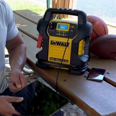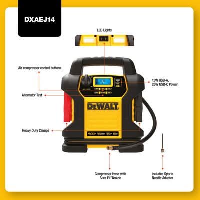 With the DeWalt DXAEJ14 Jump Starter with Digital Compressor and USB Power Bank, you no longer need to dread roadside emergencies when your vehicle won't start. This compact, portable device will test your alternator to make sure it is in proper working order a This product can expose you to chemicals including lead and Di(2-ethylhexyl) phthalate (DEHP), which are known to the State of California to cause cancer and birth defects or other reproductive harm. For more information go to www.P65Warnings.ca.gov