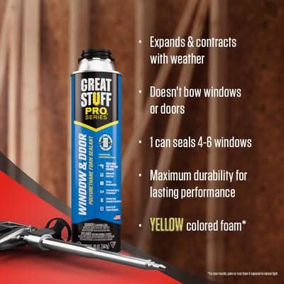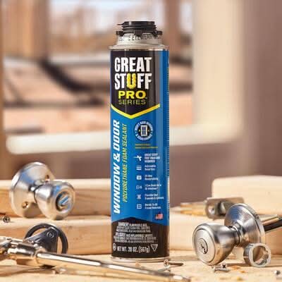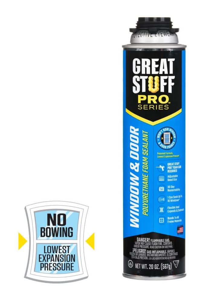 Use GREAT STUFF PRO 20 oz. Window and Door Insulating Foam Sealant to create an airtight, moisture-resistant and flexible bond. It dries in minutes after application and can be trimmed in as little as 1 hour. It works hard without being hard on surfaces.