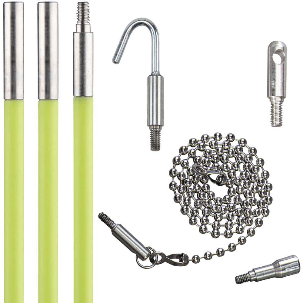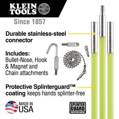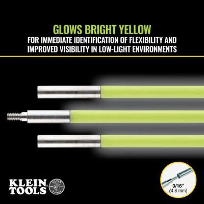 Klein Glow Fish Rods are the perfect solution for running wires through drop ceilings, attics, floors, walls and crawl spaces. This Mid flexibility rod is designed to bend enough to maneuver, but remain rigid to push longer distances. The Splinter Guard coating glows bright yellow to quickly identify the right flex for the job and improves visibility in low-light applications. This 15 ft. rod includes a bullet, hook, magnet and chain attachment Warning: Cancer and Reproductive Harm - www.p65warnings.ca.gov Size: 15 Ft