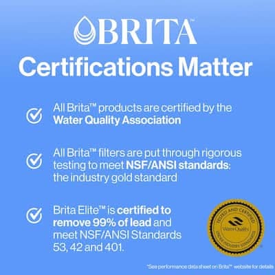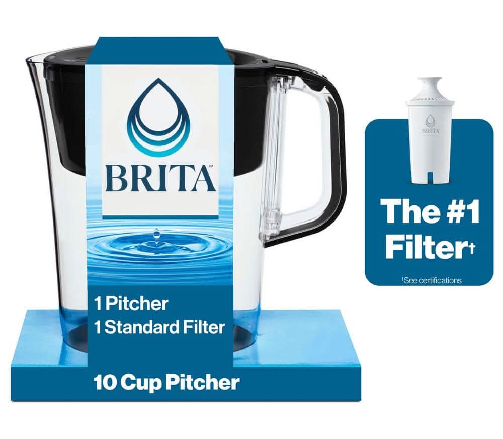 Drink healthier, great-tasting tap water with the BPA-free, large 10-cup Brita Tahoe Water Filter Pitcher. This filter cuts the taste and odor of chlorine, as well as reduces mercury, copper and other impurities, to deliver great-tasting drinking water. By switching to this Brita water purifier pitcher, you can replace 1,800 single-use plastic water bottles a year to stay hydrated, save money and reduce plastic waste. This filter water pitcher has a flip-top lid that makes refilling a breeze, while the convenient handle makes the water filtration pitcher easy to carry and pour. A SmartLight filter indicator-Brita's most accurate and precise pitcher filter life indicator-lets you know when it is time to change the filter. This Brita water pitcher comes with one Standard Brita water filter, but it's compatible with both Elite and Standard water filters. For the freshest-tasting water, replace your Elite filter after 120 gallons or approximately every six months, or replace your Standard filter after 40 gallons or approximately every two months. Get great taste, less waste and more savings from Brita.