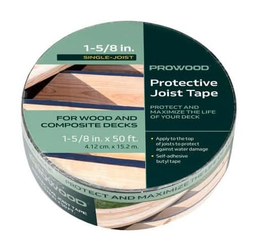 Protect your deck substructure and extend the life of your deck with Protective Joist Tape. When applied to deck joists, Protective Joist Tape creates a waterproof membrane that prevents wood rot and decay caused by the accumulation of moisture under the deck boards. Protective Joist Tape self-seals around screws and nails, blocking the primary pathway of water into lumber. When placed between treated lumber and metal, Protective Joist Tape eliminates the potential for the corrosion of the metal surface. • Color: Black • Size: 1-5/8 In. X 50 Ft.