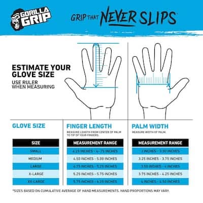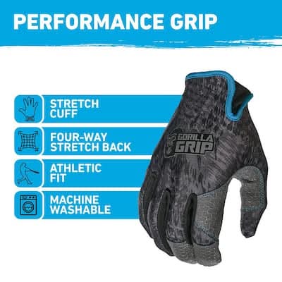 Delivering uncompromised performance and versatility, Gorilla Grip Performance Grip work gloves combine form, function, and fit for jobs that require enhanced dexterity. Designed to fit like athletic gloves, these durable work gloves feature a 4-way stretch back that naturally fits to the hand. The grip-enhanced performance palm lets you confidently handle everything from large power tools to small part California residents see Prop 65 warnings.WARNING: Cancer and Reproductive Harm - www.P65Warnings.ca.gov • Color: Black • Size: Medium