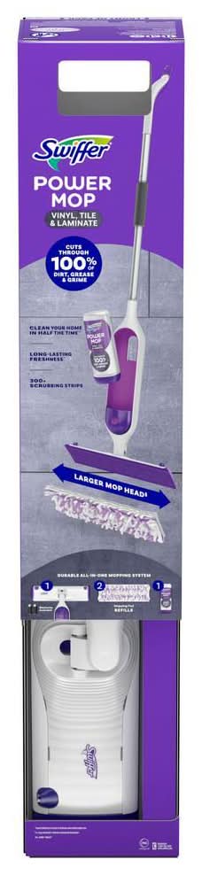 Swiffer Power Mop Vinyl, Tile and Laminate Floor Spray Mop gives you a great clean on all floors in your home. With a unique fine mist spray formula, this All-In-One mopping system provides even coverage of solution to clean thoroughly without warping or cupping. Its cleaning solution loosens dirt and lifts it off the floor, pulling dirt and grime into the Power Mop pad and locking it away for good.