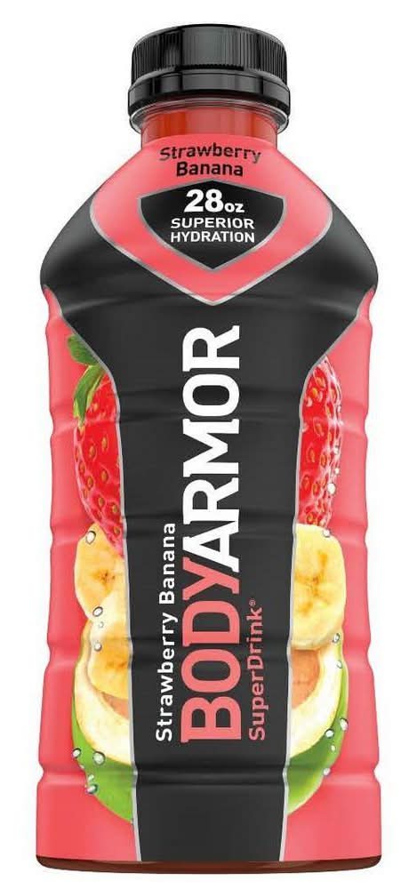 BODYARMOR is the premium, better-for-you sports drink hydrating today's athlete. It is made with natural flavors and sweeteners. It contains potassium-packed electrolytes. It also contains Vitamins B3, B5, B6, B9 and B12 and antioxidants A, C and E. • Flavor: Strawberry banana • Ba Sports Nutrition, LLC, New York,NY,11357 • Packaging: Reusable