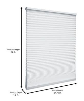 The Home Decorators Collection Cellular Shade is light filtering and energy efficient. The lightweight, yet semi-opaque fabric softly filters light while providing complete privacy. The cellular shade's honeycomb construction creates air chambers that insulate and shield your room from the outside heat or cold, helping to lower your heating or cooling bills all year round. This cordless cellular shade operates without any visible cords, providing a Certified Best for Kids cellular shade. The honeycomb-shaped cells are made with durable, spun lace fabric that forms crisp, clean pleats to keep your window looking sleek. • Color: Snow drift • Size: 34.75 In X 72 In