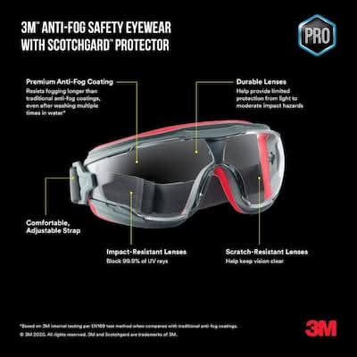 Wearing proper eye protection is key to a job well done. But it doesn"t have to mean sacrificing clear vision. Get safety eyewear that resists fogging longer than traditional anti-fog coatings, even after multiple washes with water. Premium anti-fog coating helps you see clearly for longer. Designed for challenging situations or working in challenging situations such as heat and humidity, indoor, outdoor, and climate-controlled areas. These sleek, modern styles provide protection that help block small flying objects and particles, while providing essential protection from harmful UV rays, this family of safety eyewear provides anti-fog performance that is clearly better. Based on 3M internal testing per EN168 test method when compared with traditional anti-fog coatings. Color: Gray-red