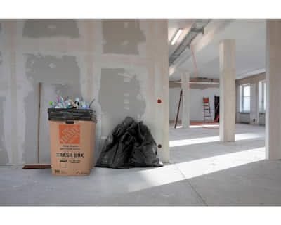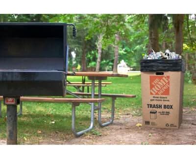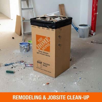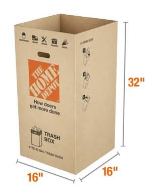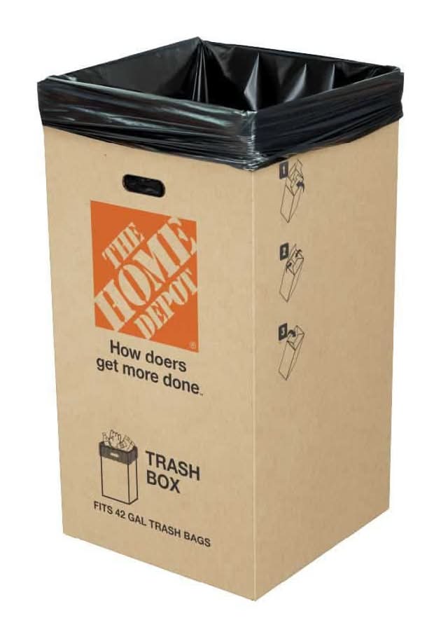 The Home Depot Trash Box is made from 100% recycled material. It's great for parties, events. and small home projects. Handles and collapsible design make it easy to transport and store for future events. Pairs well with 42 Gal. contractor bags. Packaging: Reusable