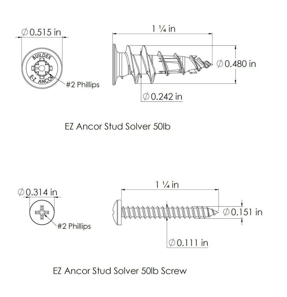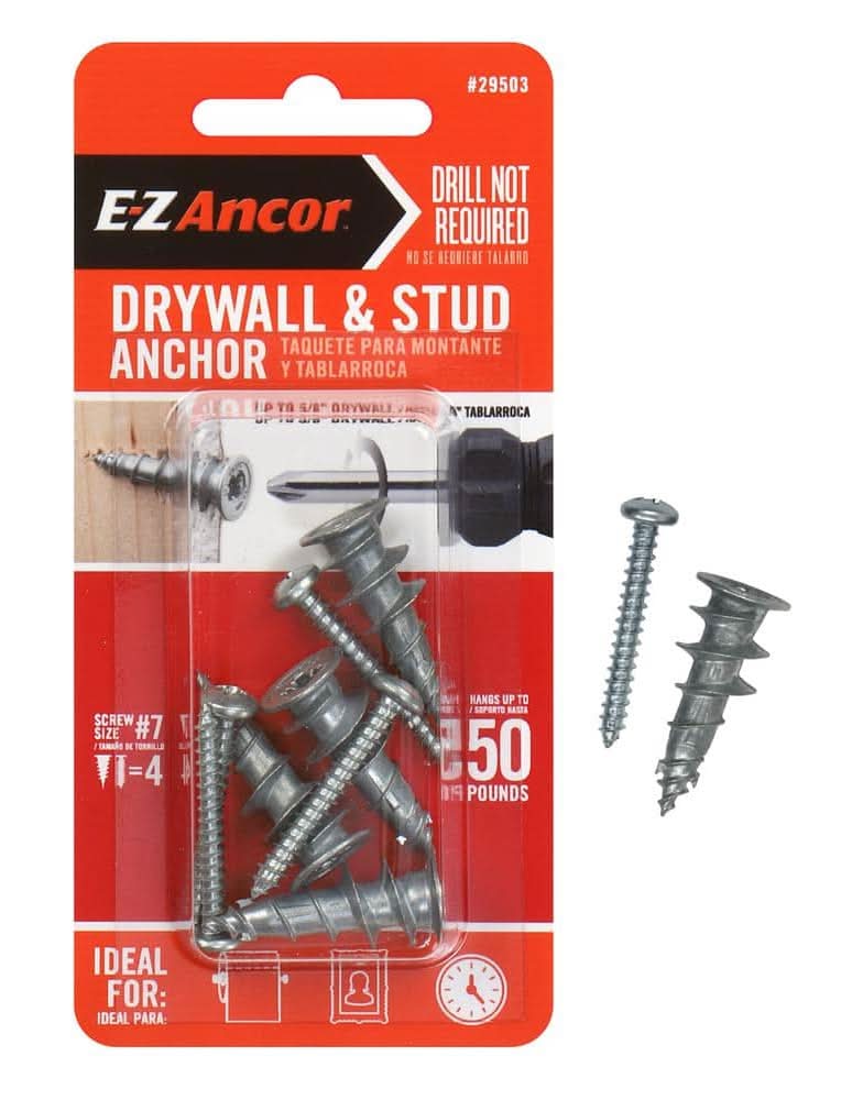 E-Z ancor stud solver anchors (4-Pack) install anywhere on a wall, even if you hit a wood stud behind the drywall. Piercing tip capable of penetrating wood to help ensure the ideal anchor spot. Install with only a #2 Phillips screwdriver (not included) and #7 x 1-1/4 in. screw (included). Stud Solver anchors are great for hanging bathroom/kitchen accessories, shelving, light fixtures, mirrors and picture frames.