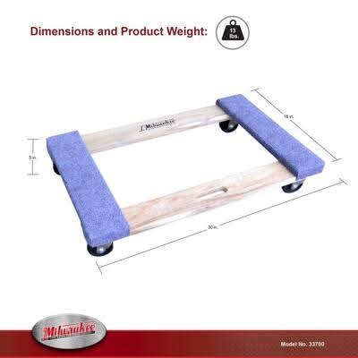 Both ends are carpeted to help protect and cushion valuable furnishings. This size also has a carrying handle which makes it easy to transport from location to location. It is ideal for moving heavy items such as furniture, cabinets, crates, and other bulky items. Milwaukee is the name the Pros trust. Size: 18 in. x 30 in